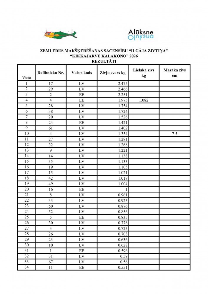 Zemledus makšķerēšanas sacensību “Ilgāja zivtiņa” jeb “Kikkajarve kalakono” 2026 rezultātu kopsavilkums